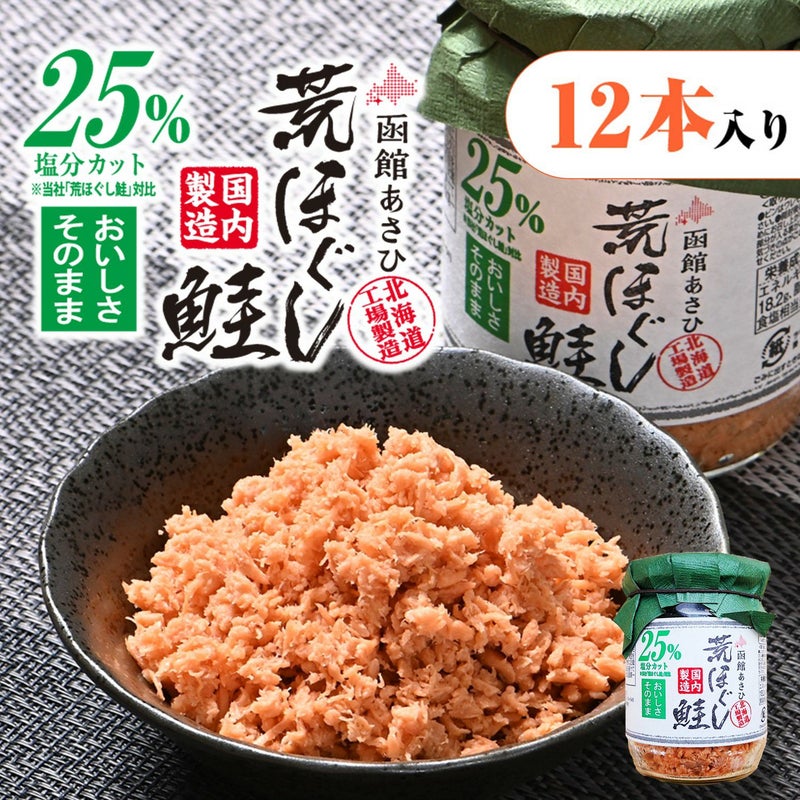 白鮭を目視・手作業で骨や皮、血合いを取り除き、荒めにほぐすことで、鮭本来の旨味と食感を残しています。塩をベースとしながら隠し味に魚醤を使用することで、ご飯が進む旨塩味に仕上げています。独自の技術でおいしさそのままに、自社通常品(荒ほぐし鮭100g)よりも25%減塩しています。通常品と同じく、ご飯やおにぎり、炒飯におススメです。 ※人力で骨等除去しているため、まれに骨が入っていることがございます。お召上がりの際はご注意ください。また、血合いや皮の一部分が入ることがございますが、品質には問題ございませんので、安心してお召し上がりください。