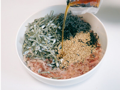 お召し上がり方 「煮干いりこ」、「かつお削りぶし」、「味付昆布」、「ごま」を混ぜ、特製「調味たれ」を加えるだけ。 自宅で簡単に作れる本格的な佃煮です。少し時間を置くと味がよくなじみ、2日目は、よりいっそう美味しく召し上がれます。 ご飯のお供としての他、お茶漬けや炊き込みご飯、サラダなど幅広くアレンジいただけます。