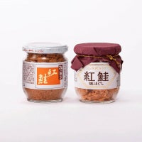 【北の便り 紅鮭】 着色料不使用。天然紅鮭を蒸してから更に焙焼することで、ふっくらと口どけのよいフレークに仕上げました。 【函館あさひ 紅鮭 焼きほぐし】 サケ・マス類の中でも旨味と脂のバランスがよく、最も美味かつ高級とも言われる天然紅鮭を、計1週間塩蔵熟成後に焼いて粗くほぐしました。少し塩辛い味付けにすることで引き締まった食感に仕上げ、より紅鮭本来の旨味を楽しめます。また、生揚げ醤油を隠し味に使用することで、紅鮭の旨味をさらに引き出しています。シンプルな1品ですが、ご飯やお茶漬けがおススメです。 ※人力で骨等除去しているため、まれに骨が入っていることがございます。お召上がりの際はご注意ください。また、血合いや皮の一部分が入ることがございますが、品質には問題ございませんので、安心してお召し上がりください。