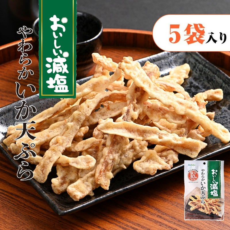 いかの胴部分を伸し、食べやすいスティック状にカットし、衣をつけて揚げました。独自の製法で素材本来のおいしさと減塩を両立させ、塩分を30%(当社「やわらかいか天ぷら」対比)カットした商品です。商品に使用している「ポリグルタミン酸」は納豆のネバ成分です。