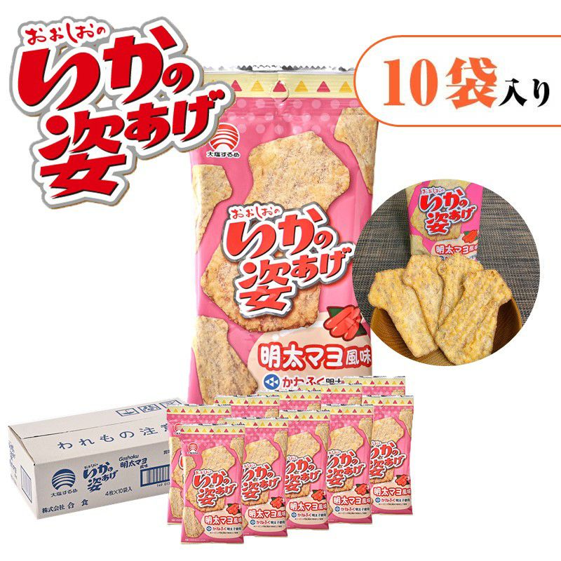 ロングセラーのいかの姿あげを「明太マヨ風味」に仕上げました。かねふくの明太子を使用しています。ピリッとした明太子の辛味と、マヨネーズのまろやかさがいかの姿あげにマッチ。おやつ・おつまみの両方にピッタリな商品です。